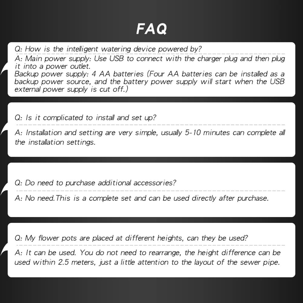 Intelligent automatic watering device can water plants regularly and quantitatively with simple settings.Even if you are on vocation or out, you don't need to worry about unmanned watering.It is suitable for home, office, garden, terrace, laboratory, agriculture, etc.